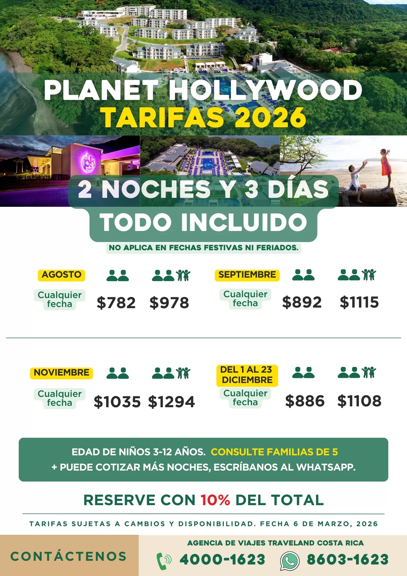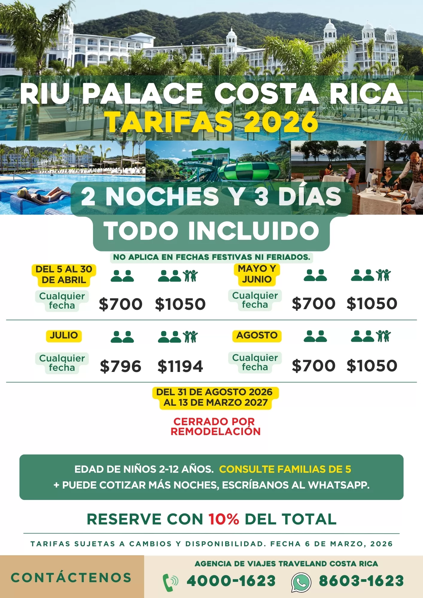 Los hoteles todo incluido en Costa Rica son la mejor forma de disfrutar unas vacaciones completas sin preocuparte por gastos extra. En Traveland Costa Rica trabajamos con las principales cadenas del país como Riu, Occidental, Barceló, Fiesta Resort, Condovac y Westin. Ofrecemos tarifas especiales para nacionales y residentes, planes familiares, escapadas románticas y opciones solo para adultos. Además, contamos con traslados compartidos y privados para que llegues a tu hotel con total comodidad. Nuestros paquetes combinan hospedaje, alimentación, bebidas ilimitadas y entretenimiento, adaptados a cada tipo de viajero. Ya sea que prefieras el lujo frente al mar en Guanacaste, el ambiente familiar en Puntarenas o la exclusividad de Papagayo, tenemos la opción ideal para ti. Reserva con Traveland Costa Rica y aprovecha nuestras promociones exclusivas en hoteles todo incluido. Disfruta del sol, la gastronomía y la hospitalidad tica con la tranquilidad de contar con una agencia local experta en vacaciones nacionales.