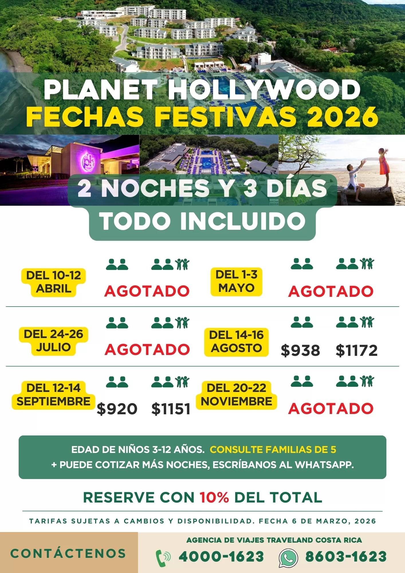 Si estás buscando precios Planet Hollywood o tarifas Planet Hollywood, aquí encontrás el detalle actualizado de paquetes todo incluido para el 2026, incluyendo fechas regulares, fechas festivas y Semana Santa.