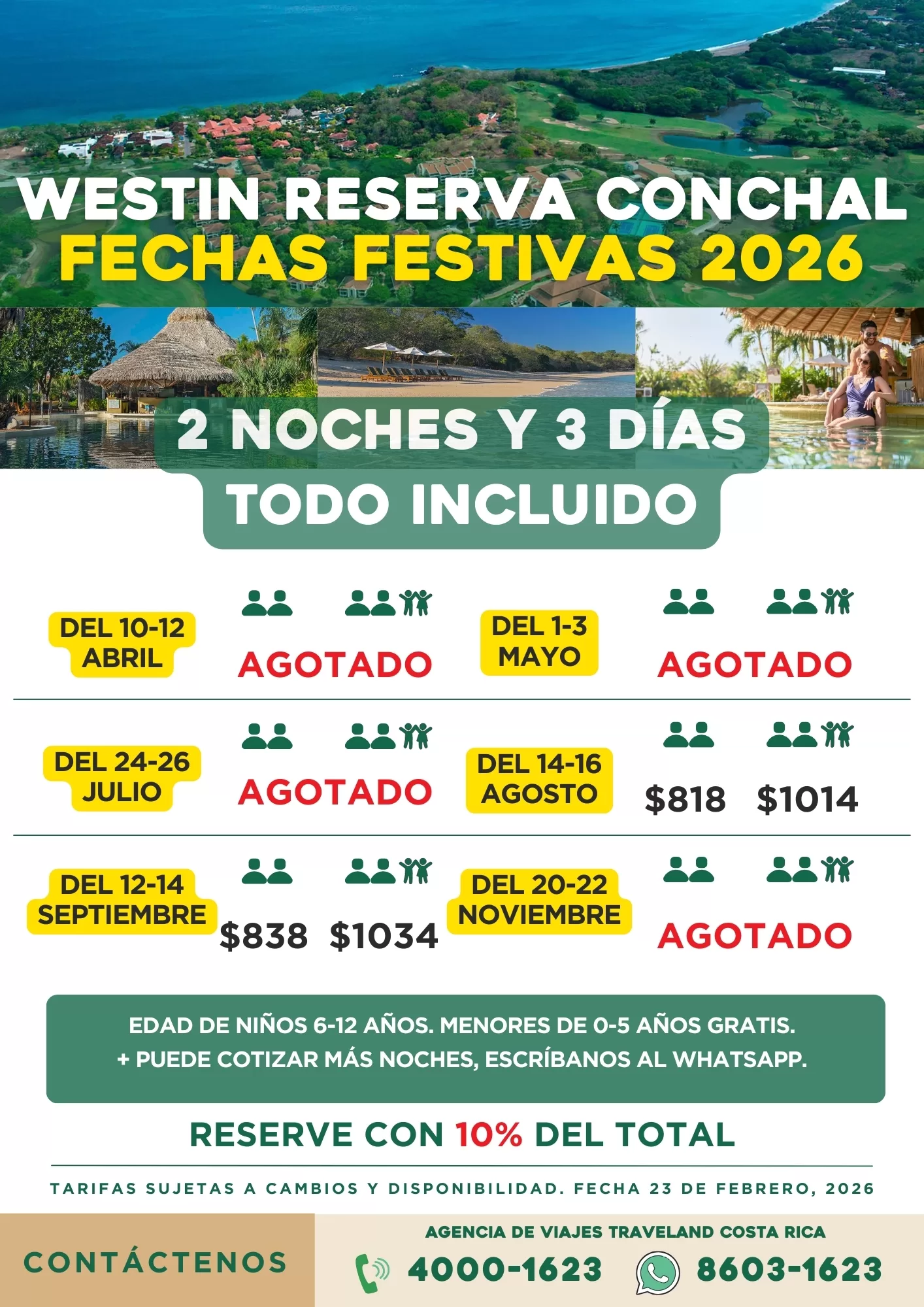Si estás buscando precios The Westin Reserva Conchal o tarifas The Westin Reserva conchal, aquí encontrás el detalle actualizado de paquetes todo incluido para el 2026, incluyendo fechas regulares y fechas festivas.